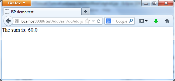 Run the server Tomcat (file startup.bat in the Tomcat/bin) and then start your Web browser and type URL: http://localhost:8080:testAddBean/add.jsp. The results will appear as follow: